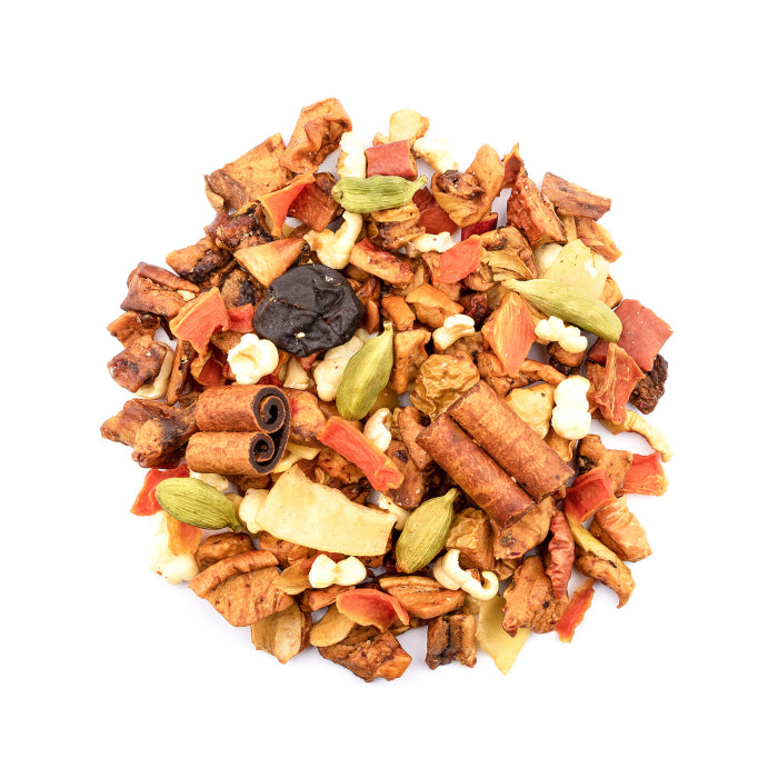 Apfelstücke (Apfel, Säuerungsmittel: Weinsäure, Wasser), geölte Weinbeeren (Weinbeeren, Sonnenblumenöl), kandierte Kirschen (Kirschen, Zucker, Sonnenblumenkernöl) (8%), gezuckerte und geröstete Kokoschips (Kokosnuss, Zucker), Karottenflocken, Aroma, Cassiarinde, Kardamomsamen, gefriergetrocknete Kirschen (2%), Puffreis, Rote Bete.