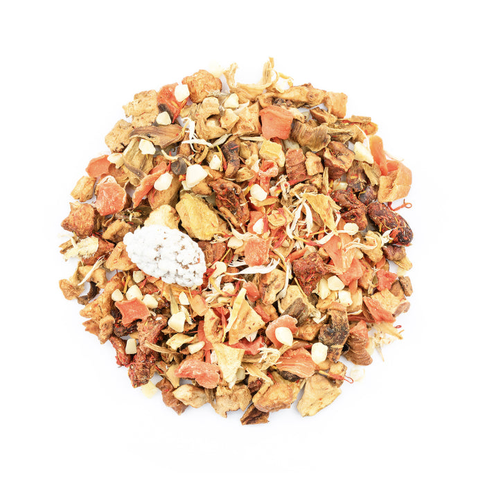 Apfelstücke, Karottenflocken, Apfelstücke gesäuert (Apfel, Säuerungsmittel: Citronensäure), weiße Hibiskusblüten, Mandelstücke, Zuckermandeln (Mandeln, Zucker), Aroma, Mandarinenspalten, Färberdisteln, Kornblumenblüten.